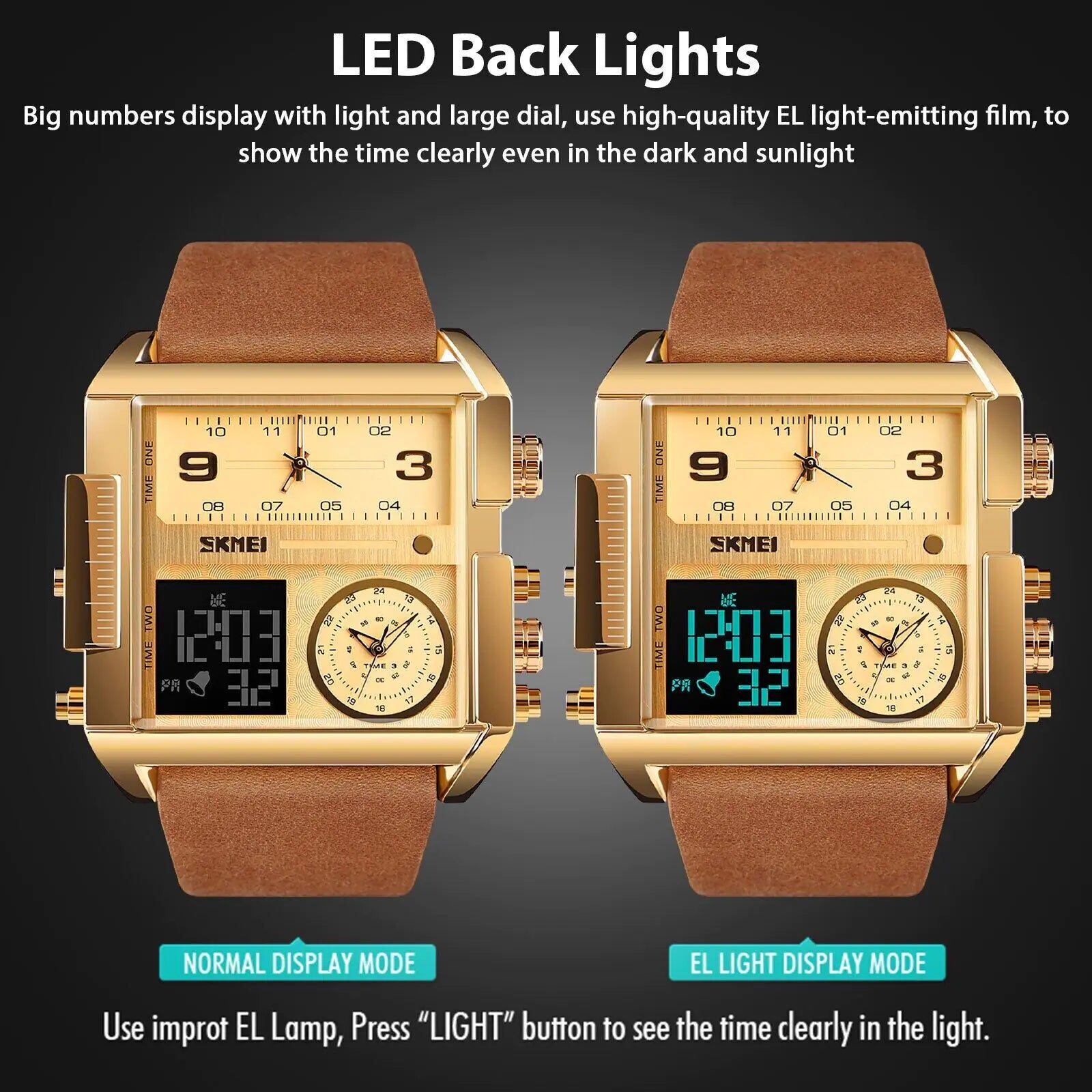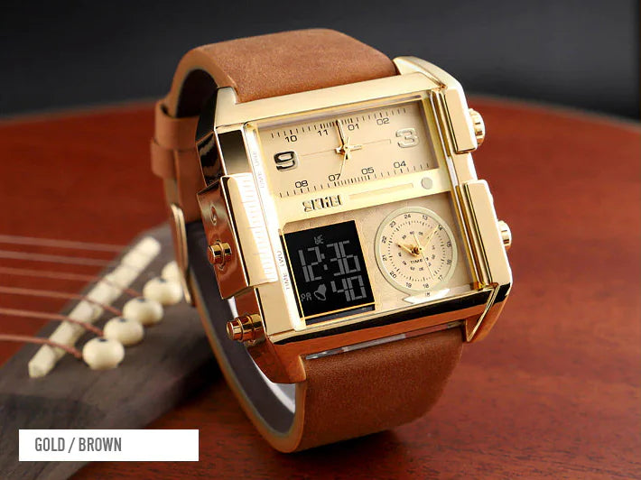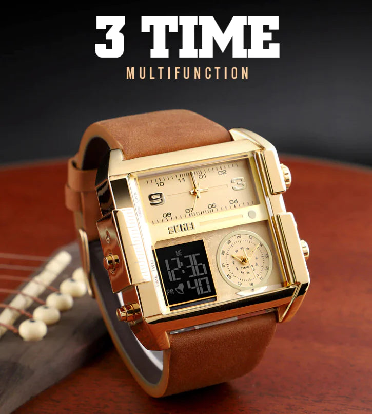 Experience the exceptional with SKMEI's Men's Large Face Multifunction Watch. Featuring a unique triple display with stopwatch, alarm, date, and dual-time functionalities. Its bold LED dial, encased in a robust zinc alloy shell with a classic leather band, combines luxury with practicality, making it ideal for both everyday wear and professional settings.